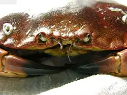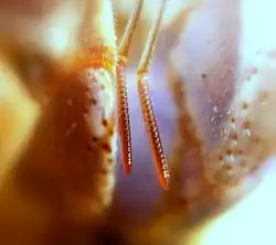 Crustaceans bear two pairs of antennae. The pair attached to the first segment of the head are called primary antennae or antennules. This pair is generally uniramous, but is biramous in crabs and lobsters and remipedes. The pair attached to the second segment are called secondary antennae or simply antennae. The second antennae are plesiomorphically biramous, but many species later evolved uniramous pairs.[2] The second antennae may be significantly reduced (e.g. remipedes) or apparently absent (e.g. barnacles).