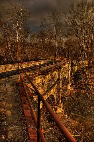 Antietam Iron Furnace Site and Antietam Village is a national historic district at Antietam, Washington County, Maryland, United States. It consists of the remains of a mid-18th to late-19th century iron furnace site, and the nearby related village. Remnants of the ironworks include a dam and race, a possible wheel pit or building foundation, the possible location of a furnace stack, and a four-arch stone bridge built by John Weaver in 1832. Also at the site are the dozen or so brick, stone, and wood houses comprising Antietam Village. Typical of the houses is the Mentzer house, a four-bay, two-storey stone structure of roughly coursed fieldstone, painted white.[2]