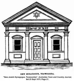- 1920 Toowoomba Synagogue attack – In 1920, an arson attack reportedly occurred at the Beth Yisrael Synagogue in Toowoomba, Queensland. The synagogue targeted in the arson attack was originally established in 1875.[145] The attackers reportedly entered the synagogue property, breaking down one of the doors, smashed a clock, and lit a fire which burned for three days causing considerable damage.[14][15]