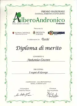 In 2013 Cecere was awarded the Diploma di Merito at the Premio Nazionale Albero Andronico[1] for "I Sogni di George".
