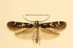 The wingspan is about 9–10 mm. The ground colour of the forewings is yellowish, sprinkled with blackish-grey. The hindwings are grey.[2]