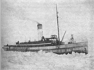 The ship was powered by a 1,500 ihp triple-expansion steam engine driving a single propeller in the stern and giving Avance a maximum speed of 13.5 knots (25.0 km/h; 15.5 mph) in open water. She had two coal-fired boilers and a smaller auxiliary boiler, all in a single engine room amidships. Her stores could hold 100 tons of coal, which was fed to the boilers at a rate of 1.3 to 1.8 tons per hour when the ship was breaking ice.[10] Like other icebreakers of her time, she was also equipped with sails which, while rarely used, remained in the inventory until the 1920s.[4]