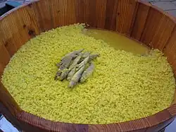 One of the more popular dishes is tiella, a slow-cooked dish layered with rice, potatoes and mussels.[22] This version originates from Bari, but there is plenty of local variation in the recipe, with different versions originating from Foggia, Taranto and the Salento. Some of these don't even include seafood.[42] Scapece is a fish dish from Gallipoli, Apulia which is notable for its preservation method. Similar to escabeche, fish is fried and then preserved in red wine vinegar with breadcrumbs and saffron to greatly extend its shelf life.[43] Some dishes use dried and salted cod (baccalà) like Baccalà in umido alla pugliese, one of the very few imported ingredients.[42] Mussels are the most used seafood, especially in Taranto, with mussles are prepared dishes like Cozze gratinate, Spaghetti con le cozze, Tubettini con le cozze, Impepata di cozze (Peppered mussles) etc...