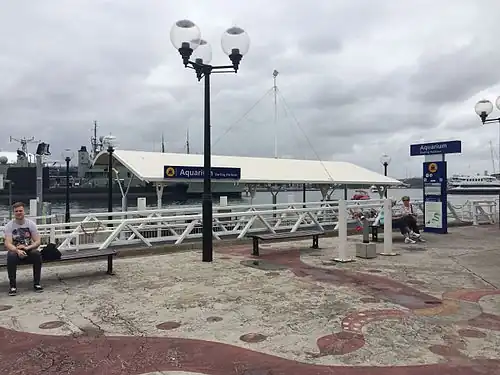 Aquarium ferry wharf (also known as Darling Harbour Aquarium ferry wharf) is a commuter wharf that serves the Darling Harbour precinct as well as the Sea Life Sydney Aquarium, which is right next to the wharf. The wharf, built in the 1980s as part of an initiative to deliver transport services to the then-newly redeveloped Darling Harbour, was originally part of the Sydney Ferries network. The wharf served as the terminus of Darling Harbour ferry services, until the wharf was decommissioned by Sydney Ferries in October 2010, when services to the wharf were rerouted to King Street Wharf 3 instead. Manly Fast Ferry currently handles services to the wharf, which acts as a terminus for their Manly - Darling Harbour Harbour loop service.