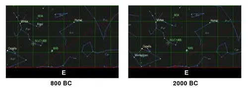 The Shatapatha Brahmana mentions that the Krttikas (the Pleiades) "do not swerve from the east".[8][9] This would have been the case with precision at 2950 BCE[7] and was true also about 2000 BCE,[10] but was still true to within 8-13 degrees (viz., East by north) around the 8th to 6th centuries BCE, the assumed date of the text's composition.