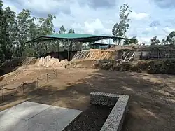 The platform is an artificial construction, walled in a rectangular plan, from limited excavations.[2] The more relevant walls are 3.3 metres (11 ft) high, 41 metres (135 ft) long and 0.60 metres (2.0 ft) wide.[2] On the eastern end, there is evidence of reinforcement, with a rectangular counter-wall, of dual pilasters, that includes four circular buildings.[2]