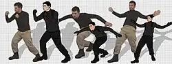 The characters are designed by Stephen Slesinski, and composed in Illustrator using referential material, among them photos of models and actors in costume.[73][71] Because Archer is produced using limited animation, characters are rendered in real-time as digital puppets, and not hand-drawn on paper and digitally composited for traditional cel animation.[74] Costumes may or may not be reproduced depending on their animatability; too much detail can hurt a character's animatability.[70] These body pieces are then separated into basic components and layers, much like an action figure, and rigged in After Effects.[71][74] Consequently, one given pose can turn into a range of others, which, according to producer Bryan Fordney, creates "the illusion of more animation on screen than what is actually present."[74] A similar technique is used in the animation of a character's face—head illustrations are divided into basic components that can be turned "off" and "on" in sequence, lending the appearance of facial movement and expression in real-time.[75][70]