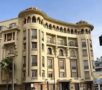 The former administrative square, now Muhammad V Square, is surrounded by buildings in a style called Neo-Moorish, which combines Mauro-Andalusi and Art Deco architecture.[11] One of the first buildings to employ this style was Hotel Excelsior, built 1912–1914.[11] It was also used in the Old Abattoirs, an industrial slaughterhouse renovated by Prost in 1922.[11] Neo-Moorish elements were also present in private palaces and residences such as the Glaoui Building.[38]