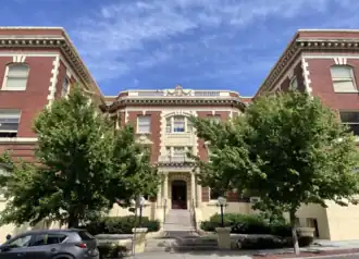 Some of the earliest apartment buildings in the city were pioneered by Albert Held, who was the architect behind the Amman, San Marco, Breslin, and Knickerbocker, which still exist today and were added to the National Register of Historic Places as the Apartment Buildings by Albert Held Thematic Group in 1987. This group of buildings are significant because they illustrate the evolution of apartment building design in Spokane. The Amman was built in 1904, and as possibly the first apartment built in Spokane, it typifies the first stage of apartment evolution, with its simple, rectangular and residential appearance and shingled hip roof with a simple interior, while the San Marco (built 1904) and Knickerbocker (built 1911) represent the intermediate stage of development when apartments were designed and looked like exclusive clubs, with highly ornamented façades and imposing entryway porticos along with a reception desk and elaborately designed interiors.[55] The U-shaped and H-shaped buildings offer residents views of landscaped rear courtyards. Finally, the Breslin represents the last stage of early apartment development in Spokane. The six-story structure was built in 1910 and is much taller than the Amman at only one-half stories and is thought to be the tallest residential building built in Spokane prior to World War II.[55] The Neoclassical Revival building has the appearance of a tall office building, with a cell-like repetition of paned glass windows.