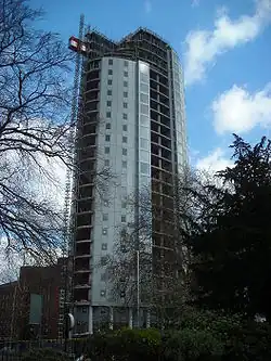 On the site of the Fairfield Building of Croydon College, a mixed-use development named the Croydon Vocational Tower had begun construction. The planned architecture and design of the building had similarities with the Trump International Hotel and Tower in Chicago. Planning permission was approved by Croydon Council in February 2007, but building work had been slow since. It was to be used for both educational purposes on the lower 10 floors by the college and private use as a residential tower on the rest of the 29 floors. There would have also be a floor of leisure use which will be used by students of the college and residents of the tower. The building, once finished, would have a structural height of 134 m (439 ft) with the tower measuring 119.8 m in height to the top of the lift motor room, with an architectural spire protruding above this to a height of 133.8 m.[14] As of 2025, the site had been used for a different construction project, Enclave: Croydon, which was completed in 2023.[15]
