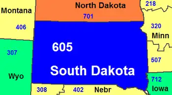 The map above is clickable; click on an area code to go to the page for that code. South Dakota's area code in blue with border states shown in yellow, orange and green