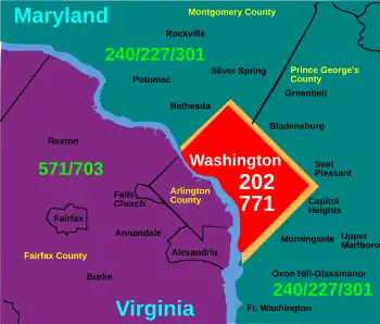 Areas such as Alexandria, Arlington,[12] Fairfax,[13] Falls Church, McLean and Tysons in Virginia[14] (703/571) and Rockville,[15] Gaithersburg,[16] Upper Marlboro,[17] Bethesda[18] and Landover in Maryland[19] (301/240) are a local call to Washington.