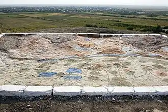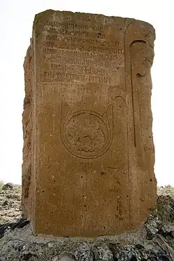 The historiography of Argištiḫinili is intimately tied with that of old Armavir, one of the capitals of Armenia. Moses of Chorene has written in his History of Armenia of the founding of Armavir by Aramais, grandson of Hayk, the legendary ancestor of the Armenians.[2][3] Old Armavir, as was demonstrated by archaeological digs in the 20th century, was located atop the erstwhile Argištiḫinili from the 4th century BC onwards.[4] In the 1830s, the Swiss traveller Marie-Frédéric Dubois de Montpéreux had suggested that a mound near the village of Nor Armavir could be the ancient fortress of Armavir. Interest in the site increased with the discovery in 1869 of cuneiform tablets, which turned out to date from the time of Argishti I and Rusa III. In 1880, excavations at the Armavir hill began, conducted by imperial Russian archaeologists ahead of the Fifth Russian Archaeological Congress at Tiflis.[5]