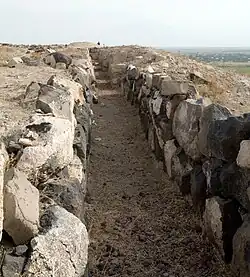The better excavated western fortifications are on biggest of five elevations comprising the Hills of David. Their entrance was to the north on a packed mud ramp. The fortress comprised three units, each consisting of small rooms spread out around a central yard. Movement between the units was ostensibly regulated, given the narrow single paths that connected them, whereas within a unit, movement was free.[13][14]