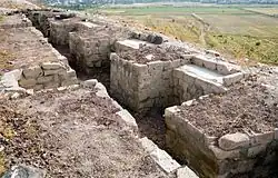 Rusa II attempted to stem the decline of Urartu but was largely unsuccessful. A new granary, mentioned in an inscription by king Rusa III, was probably the large major building works in Argištiḫinili.[7] Shortly thereafter, civilians and the army appear to have abandoned the fortress of Erebuni (at the time the main military centre in the Ararat Plain) on tactical grounds, and joined the main forces at the great fortress of Teishebiani, thereby putting Argištiḫinili at risk of attack.[4][19] Indeed, around 600 BC, this town was captured and torched. Archaeologists have discovered evidence of assault weapons, major conflagration and extensive deaths of residents. Argištiḫinili was probably destroyed by the Scythians[19][20] or the Medes,[21][22] and thus lasted fewer than 200 years.