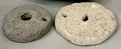 | Above: stone mills for grinding wheat into flour. On the left is a handheld tool, on the right is an industrial version. Left: a Karas, or clay-pot, found at a vine-vault at Argištiḫinili. Karases were dug into the ground to about 80% of their height; the buried parts of the pots have survived better than their exposed necks. In such karases were stored nearly 160,000 litres of wine at Argištiḫinili. | ||
