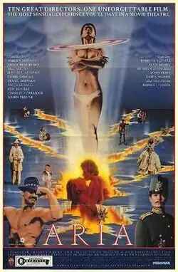 Aria is a 1987 British anthology film produced by Don Boyd that consists of ten short films by ten different filmmakers, each showing the director's choice of visual accompaniment to one or more operatic arias. There is little or no dialogue, with most words coming from the libretto of the operas in Italian, French, or German.