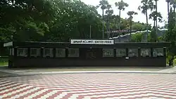 The main entrance of the park is located towards the south west along the Grand Southern Trunk Road. The entire campus is enclosed by a compound wall.[27][30] Close to the entrance, there is a children's park on one side and lawns on the other side. The enclosure of water fowl is located close to the children's park next to the primate section, followed by the terrestrial birds. A circular pathway takes the visitors to the interior of the park around the hillock. The enclosures for the carnivores are situated on the top of the hill with the herbivore exhibits along the slopes. Lower down the road are two smaller loop sections with one consisting of the bear enclosures and the other accommodating the walk-through aviary. The bear section leads to the lion safari at the north east corner of the zoo.[31]