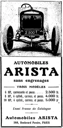 The Arista was a French automobile manufactured by the Établissements Ruffier in Paris from 1912 to 1915. The marque took its name from its founder, one P. Arista-Ruffier. Eight models were introduced in the first year of production; these were a 720 cc single cylinder cycle car, fours of 1460 cc, 1726 cc, and 1847 cc which featured friction drive and were sold complete with bodywork and tires, and fours of 1460 cc, 1593 cc, 1847 cc, and 2001 cc with conventional gearboxes; these last were sold as untired chassis.