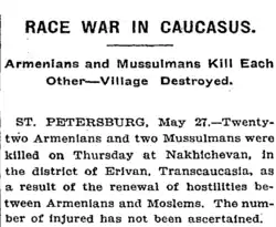 20. ^ "RACE WAR IN CAUCASUS.; Armenians and Mussulmans Kill Each Other -- Village Destroyed". The New York Times. 28 May 1905. Archived from the original on 26 July 2022. Retrieved 26 July 2022.