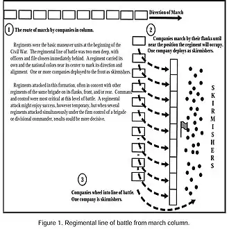 With the enemy located, infantry formed up in their battle lines as artillery and skirmishers harassed the enemy with preparatory fire. A flanking maneuver was the preferred method of attack but not always possible, making it often necessary to conduct a frontal assault. In this case feints were made in the hope of drawing off the enemy's attention.[22] Prior to the Civil War and in its first year the regiment was the primary unit of maneuver on the battlefield, but it was soon superseded by the brigade in both armies, often as part of a larger division-based attack. Two or more of a division's brigades would lead the attack with the rest as a ready reserve, and its movements were often part of a larger coordinated attack by a corps.[23]