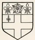 Escutcheon: Or, a cross Gules charged in the centre with a mullet of the field, on a chief Ermine an open book Argent embellished of the first between two roses of the second, barbed and seeded Proper.