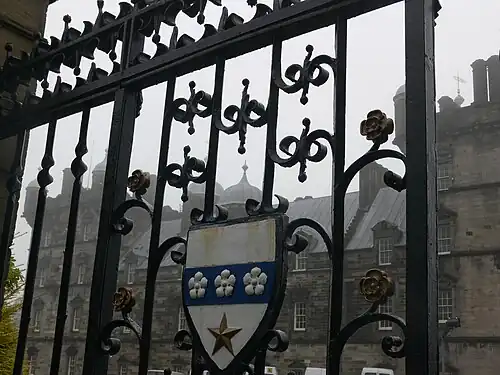 Escutcheon: Silver saltire cross on the blue ground of Saint Andrew, the national arms of Scotland. The fleur-de-lys is the emblem of the Trinity, while the sun and crescents are taken from the arms of Lothian and Buccleuch respectively. |
