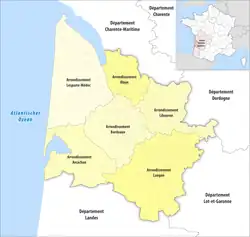 In 1800 the arrondissements of Bordeaux, Bazas, Blaye, Lesparre, Libourne and La Réole were established. In 1926 the arrondissements of Lesparre and La Réole were disbanded, and Langon replaced Bazas as subprefecture. The arrondissement of Lesparre-Médoc was restored in 1942.[2] At the May 2006 reorganisation of the arrondissements of Gironde, the arrondissement of Bordeaux absorbed the canton of Saint-André-de-Cubzac to the arrondissement of Blaye, the cantons of Cadillac and Podensac to the arrondissement of Langon and the canton of Castelnau-de-Médoc to the arrondissement of Lesparre-Médoc.[2][3] The arrondissement of Arcachon was created in January 2007 from the four cantons of Arcachon, Audenge, Belin-Béliet and La Teste-de-Buch, that were previously part of the arrondissement of Bordeaux.[2][4]