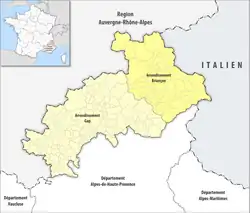 In 1800 the arrondissements of Gap, Briançon and Embrun were established. The arrondissement of Embrun was disbanded in 1926.[2]