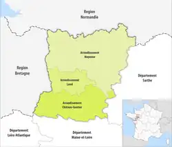 In 1800 the arrondissements of Laval, Château-Gontier and Mayenne were established. The arrondissement of Château-Gontier was disbanded in 1926, and restored in 1942.[2] On 1 January 2019, the commune of Château-Gontier was merged into the new commune of Château-Gontier-sur-Mayenne, which became the subprefecture for the Arrondissement of Château-Gontier.