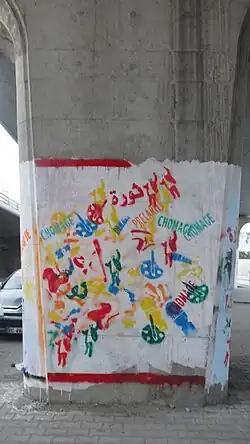 In the months during and following the revolution, street art played a major role by reclaiming public spaces that used to be controlled by the government and by letting artists and ordinary citizens express themselves freely for the first time in years.[12] Individual artists or groups like the student-run Ahl El Kahf collective used stencils, graffitis and paintings to depict political or revolutionary themes, such as the portrait of Mohamed Bouazizi.[13] In addition to using local revolutionary symbols, street artists also reused Western and Latin American revolutionary icons in the work.[14] Murals were one of the most common form of street art, representing, for instance, people killed during the revolution.[15] In effect, graffiti artists in the Tunisian Revolution founded a "culture of resistance", much like Palestinians' tradition of subversive comic art.[16]