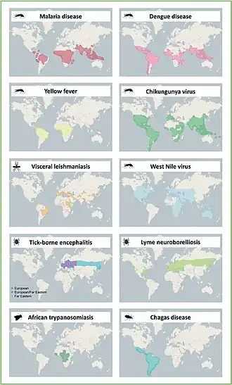 In addition to stings and bites causing discomfort in of themselves, bites can also spread secondary infections if the arthropod is carrying a virus, bacteria, or parasite.[8] The World Health Organization (WHO) estimates that 17% of all infectious diseases worldwide were transmitted by arthropod vectors, resulting in over 700,000 deaths annually.[9] The table below lists common arthropod vectors and their associated diseases. The figure below represents endemic areas of common vector-borne diseases.