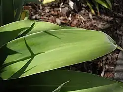 The leaves are 30–60 cm (12–24 in) long and 3–10 cm (1.2–3.9 in) wide.[6] The flower stalk often reaches one metre, and bears many white six-petalled flowers, in groups of two or three, each about 2 cm (0.8 in) across. The stamens are tricoloured - purple and white, with yellow at the curled end. The roots are 2–3 cm (0.8–1.2 in) wide.