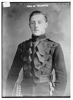 Lord Dalhousie obtained a commission as a 2nd Lieutenant in the Forfar and Kincardine Artillery, a Militia regiment, on 10 June 1897,[1] and transferred to a Regular Army commission in the Scots Guards on 10 February 1900.[2] Following the outbreak of the Second Boer War in late 1899, the 2nd Battalion Scots Guards was posted to South Africa as reinforcements in April 1900. He served there with the battalion until the end of the war, and was promoted a lieutenant on 14 December 1901.[3] The war ended with the Peace of Vereeniging in June 1902, and Lord Dalhousie left Port Natal with other men of the 2nd battalion Scots Guards on the SS Michigan in late September 1902, arriving at Southampton in late October, when the battalion was posted to Aldershot.[4]