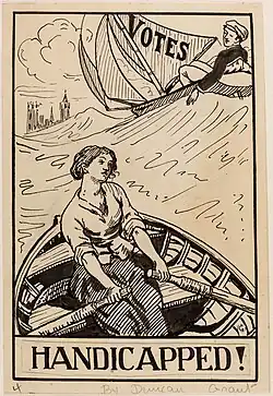 The artist Duncan Grant, whose aunt, Lady Strachey was a member of the National Union of Women's Suffrage Societies, entered the ASL poster and postcard competition in 1907. Although not a prize winner, he was encouraged to enter the ASL’s 1909 competition for a poster that was "suitable for use at elections". ASL member Barbara Forbes suggested "a man in a sailing boat (the sail represents the Vote). A woman with only oars - out in the sea of Labour". Grant was awarded the first prize, four pounds, for a poster depicting a woman heading towards the Parliament of the United Kingdom rowing a boat in heavy seas, while a man in a sailing boat effortlessly passes her on a high wave. Grant added the caption "Britons, why handicap the weaker vessel?", which was shortened to "Handicapped!" in the poster published by the ASL. It became one of the ASL's most striking posters.[2]