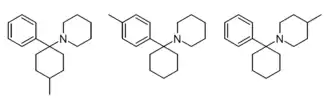 - ^ Iorio MA, Tomassini L, Mattson MV, George C, Jacobson AE (August 1991). "Synthesis, stereochemistry, and biological activity of the 1-(1-phenyl-2-methylcyclohexyl)piperidines and the 1-(1-phenyl-4-methylcyclohexyl)piperidines. Absolute configuration of the potent trans-(-)-1-(1-phenyl-2-methylcyclohexyl)piperidine". Journal of Medicinal Chemistry. 34 (8): 2615–23. doi:10.1021/jm00112a041. PMID 1875352.