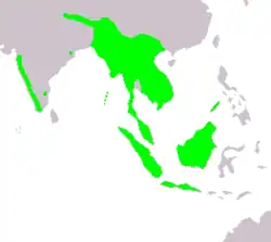 The Asian fairy bluebird is found in Sri Lanka and the western coast of India from Travancore up to the latitude of Shivamogga, Belgaum and Sawantwadi; Sikkim and the lower ranges of the Himalayas to Dibrugarh in Assam; the Khasi Hills; Cachar; Manipur; Bangladesh; Arrakan; Bago and Taninthayi Division in Burma; the Andaman and Nicobar Islands. In southeast Asia it occurs throughout most of Indochina (including Peninsular Malaysia), Sumatra, Borneo, Java and on smaller nearby islands. In the Indian part of its range this species is confined to the evergreen forests of the hills and plains, but elsewhere it is regular in various types of humid and deciduous forests from lowlands up to about 1,600 metres (5,200 ft). The species has been reported to be more frequent in mature rainforests and in rustic cardamom plantations under native shade trees than in coffee plantations.[2]