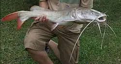 Hemibagrus wyckioides reaches a length of 130 centimetres (51 inches) TL.[1] This species is the largest Bagrid catfish in Asia, and may reach 80 kilograms.[3] The caudal fin is white when the fish is small, but it becomes bright red when it reaches about 15 cm (6 in).[1]