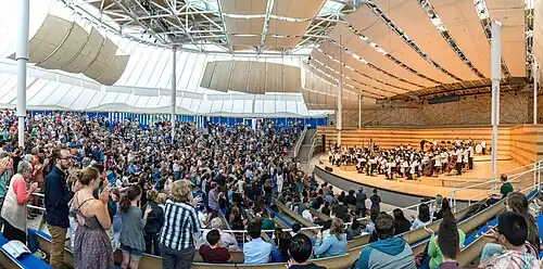 The Michael Klein Music Tent, which opened in 2000, is the Festival's primary concert venue and seats 2050.[27] The tent replaced an earlier tent designed by Herbert Bayer, which in 1965 replaced the original smaller tent designed by Eero Saarinen.[28] Concerts are held in the Michael Klein Music Tent on a nearly daily basis during the summer, and seating on the lawn just outside the Tent, where many choose to picnic during events, is always free.[29] The design has open sides; the curving roof is made of Teflon-coated fiberglass, a hard material also used by the Denver International Airport.