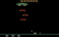 Assault is a 1983 fixed shooter video game developed and published by Bomb for the Atari 2600.[2] Controlling a spaceship fixated at the bottom of the screen, gameplay involves the player shooting projectiles towards an enemy mothership that deploys smaller ships to attack the player. The player must also prevent enough projectiles from touching the bottom of the screen.