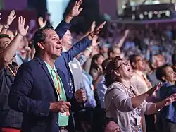 The Assemblies of God emerged as the leading Pentecostal denomination in terms of status, wealth, influence, and global adherence.[76] In the 1980s, the Assemblies of God saw rapid growth in the U.S., for several years ranking as the fastest growing American denomination. This growth was mainly the result of its Hispanic outreach (in 1988 Hispanic members made up some 15 percent of the fellowship's total constituency).[77] The growth of an Asian immigrant constituency was also recognized in this decade when the first Korean district was created. The Assemblies of God gained national visibility in the late 1980s from the popularity and later scandals surrounding two of its ministers, Jimmy Swaggart and Jim Bakker.[78] The Assemblies of God launched an effort to increase evangelism and growth in the 1990s called the "Decade of Harvest". Such efforts failed to sustain the impressive growth of the 1980s, however. From 2003 to 2008, growth had slowed to an average annual increase of just over 1 percent.[76]