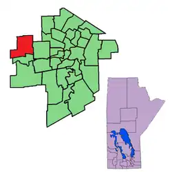 Assiniboia is a provincial electoral district of Manitoba, Canada. It was first created for the 1879 provincial election, was eliminated in 1888, and was re-established in 1903. It is located in the westernmost tip of the city of Winnipeg.