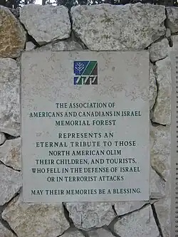 AACI hosts an annual memorial service in honor of Americans and Canadians who have fallen in the service of the State of Israel or as victims of terrorist attacks. The memorial to over 300 people takes place at the AACI Memorial Forest, near Sha'ar Hagai. AACI believes it is an obligation to remember and honor those from the North American Jewish community who made the supreme sacrifice to ensure the existence of a Jewish State. The Memorial also educates the next generation of English speaking Jews about the heroism of those who have fallen.