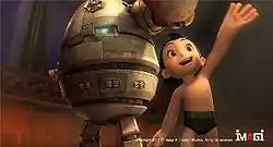 Like what Imagi did with TMNT in 2007, the film was CGI animated on Maya and rendered on Pixar's RenderMan at Imagi's Los Angeles facility and its main studio in Hong Kong. Some changes to Astro's design had to be made in order to appeal to a western audience and making the leap to CGI. The more challenging was his kawaii portrayal, part of which were his large eyes and curly eyelashes, features that the filmmakers thought made him too feminine. Imagi had several discussions on how round and curvy Astro's body proportions should be and in the end they were made slimmer. The by-product of these changes was Astro's Caucasian look.[14] In early development Astro's design was young, resembling his iconic design of a 9-year-old boy. The design team changed that and made him look like a 13-year-old to appeal to a larger audience.[14] They also gave him a white shirt, and a blue jacket since they thought it would be strange to have a normal boy running around without one.[15] They also replaced his heart-shaped energy core with a glowing blue one.[16]