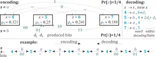 This way we can encode a sequence of symbols into a large natural number x. To avoid using large number arithmetic, in practice stream variants are used: which enforce by renormalization: sending the least significant bits of x to or from the bitstream (usually L and b are powers of 2).