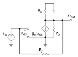 6. ^ Because the input voltage vGS approaches zero as the return ratio gets larger, the amplifier input impedance also tends to zero, which means in turn (because of current division) that the amplifier works best if the input signal is a current. If a Norton source is used, rather than an ideal current source, the formal equations derived for T will be the same as for a Thévenin voltage source. Note that in the case of input current, G is a transresistance gain.