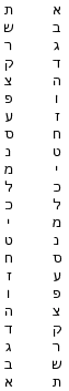 | ◢→ | Aleph | Bet | Gimel | Daleth | Heh | Vav | Zayin | Het | Tet | Yodh | Kaph | Lamed | Mem | Nun | Samech | Ayin | Peh | Tzady | Koof | Reish | Shin | Taw |