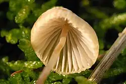 The gills are ascending and somewhat hooked or toothed, narrow at first but becoming rather broad (2.5 mm and becoming 3–4 mm). They are nearly equal in width throughout or slightly ventricose in age, with a spacing that is close to subdistant. About 18–24 gills reach the stem, with two tiers of lamellulae (short gills that do not extend fully from the cap margin to the stem) that may develop veins running between them. The gills are white to creamy-white with edges that are even and whitish, and waxy in appearance and consistency. The stem is 3–8 cm (1.2–3.1 in) long, 1–2.5 mm (0.04–0.10 in) thick, equal, tubular, somewhat elastic, cartilaginous, and not particularly fragile. The base of the stem is either strigose (covered with sharp, straight, stiff white hairs) or surrounded with a matted white mycelium. Above the base, the stem is smooth, and pruinose toward the apex. When moist it is translucent with slight ripples running transversely, and white to pale yellow.[9]