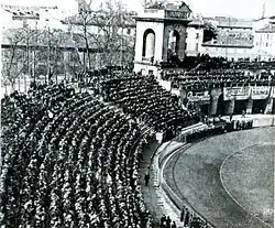 Winning the domestic league also granted Athletic entry to the European Cup, the first edition of which had been won by Spanish rivals Real Madrid.[13] During the 1956–57 campaign,[14] They defeated FC Porto in the opening round and were then drawn against Budapest Honvéd of Hungary at a significant point in that nation's history.[15][16][17] Before the first leg of their tie – originally scheduled for Budapest – had been played, the Hungarian Revolution of 1956 began. The Honvéd players, who formed the backbone of the 'Mighty Magyars' international side, were already out of the country, but their families remained at home amidst the chaos of the uprising. The legs were switched, with Athletic winning narrowly 3–2 in Bilbao.[15][16][17]