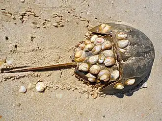 A wide range of marine species become attached to the carapace, including algae, flat worms, mollusks, barnacles, and bryozoans, and horseshoe crabs have been described as 'walking museums' due to the number of organisms they can support.[15] In areas where Limulus is common, the shells, exoskeletons or exuviae (molted shells) of horseshoe crabs frequently wash up on beaches, either as whole shells, or as disarticulated pieces.